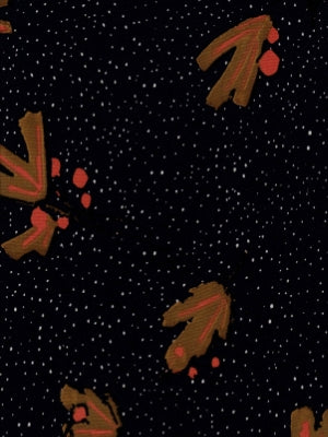 A midnight ground scattered with delicate ivory speckles, accented by painterly ochre fronds and subtle crimson touches. Sophisticated and artful, with a refined, contemporary charm.
